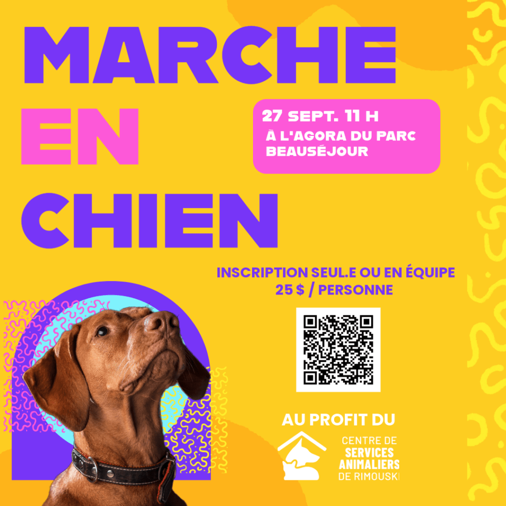 Le 27 septembre 2025, venez participer à notre première édition du marcheton Marche-en-Chien au profit du Centre de services animaliers de Rimouski (CSAR) en collaboration avec Le Chien Coureur !